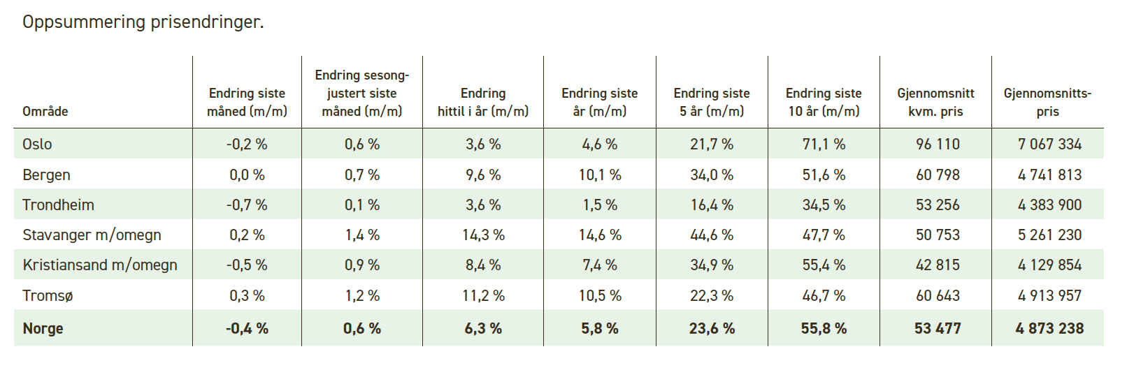 Sterkest sesongkorrigert prisutvikling i oktober hadde Stavanger m/omegn med en sesongjustert oppgang på 1,4 prosent foran Tromsø med en sesongjustert oppgang på 1,2 prosent.